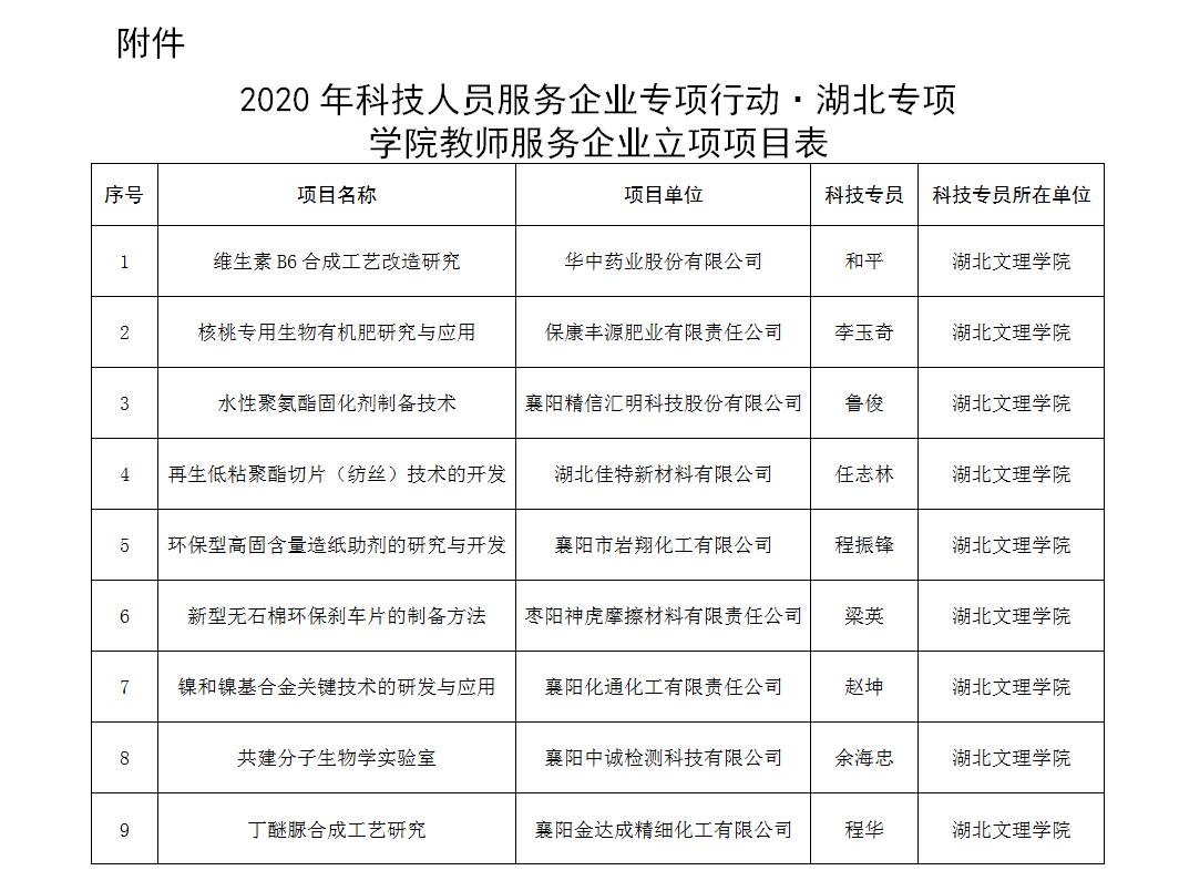 近日,省科技厅公示了2020年科技人员服务企业专项行动·湖北专项(第二批)拟立项项目清单,公司7位教师入选。在此前第一批立项项目中,公司有2位老师入选。此次科技人员服务企业专项行动·湖北专项,公司共有22位老师服务的企业获得立项支持,将获扶持资金220万元。科技人员服务企业专项行动·湖北专项是中央支持湖北的重要事项,通过搭建技术对接网络平台,打通湖北科技型中小企业技术需求与全国科技人员的对接通道。对与高校院所科研人员达成合作的项目,择优给与经费支持,切实降低科技型中小企业引才成本,助力复工复产,提升企业自主创新能力,培育一批科技型企业。