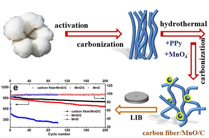 锂离子电池作为一种新能源技术,因其绿色环保、能量密度高等优点在便携式电器、交通运输等方面发挥着越来越重要的作用,电极材料是影响锂离子电池性能的重要因素。生物质如棉花中含有大量的纤维素、木质素、糖等丰富的碳源,将其与MnO复合,利用生物碳材料的微纳结构和优异的电子传导性,可明显改进MnO负极材料的充放电循环性能。基于此,占丹团队从资源的高效循环利用和新能源技术的角度出发,以棉花为原料,利用棉花纤维的独特结构及其中丰富的碳源,提出了一种简便的方法来原位制备碳纤维/MnO/C复合材料。该复合材料在室温下,0.01-3.0V的电压范围内,充放电流密度从0.1逐渐升至3Ag-1,充放60周后材料仍能保持初始容量(1238.5mAhg-1)的35.3%,表现出优秀的高倍率性能和循环稳定性。该成果由公司与桂林电子科技大学、加州大学伯克利分校等多个课题组合作完成,得到了国家自然科学基金(项目编号51708191)和“机电汽车”湖北省优势特色学科群开放基金的支持。