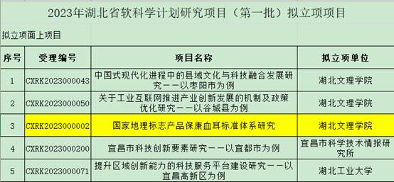 (通讯员 刘向红) 近日,2023年湖北省软科学计划研究项目(第一批)拟立项项目公示,公司植物资源研究开发创新团队隋哲博士申报的课题《国家地理标志产品保康血耳标准体系研究》成功获批。