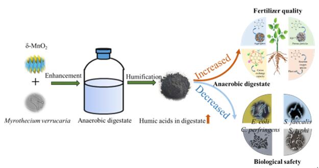 厌氧发酵液作为沼气工程的副产物,具备作为有机肥在农田施用的巨大潜力。但前期研究发现厌氧发酵液中含有较低的活性物质和较高的病原体数量,限制了其大规模应用。基于此,本研究创新的提出了一种由Myrothecium verrucaria介导的生物腐殖化过程结合MnO2介导的非生物腐殖化过程的处理工艺,不仅可以提高厌氧发酵液中的活性成分含量,并且显著降低了病原体的数量。这项研究为提高厌氧发酵液的肥料质量和农田应用的生物安全性提供了一种新的策略。