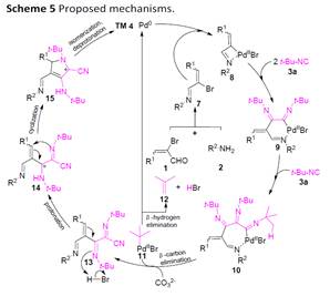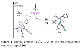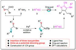 含氮杂环是一类重要的有机化合物,广泛的存在于生物医药分子当中,如何建立一条高效的合成氮杂环的方法一直是合成化学中的研究热点。异腈是一类高活性的类卡宾物种,反应活性高,然而如何有效的控制其活性进行选择性的化学转化是研究中的难点问题。本文报道了一种新颖的三组分反应来合成多取代吡咯的新方法。该方法的主要特点是:亚胺官能团的引入诱导了三个异腈分子的有序插入;反应中无需加入额外的配体;DFT理论计算支持了所提出的反应机理。
