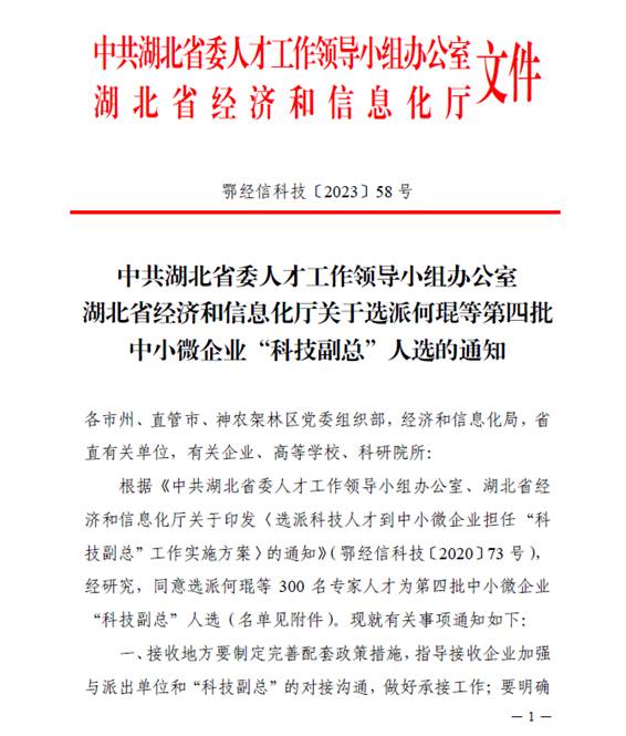 (通讯员 刘向红)日前,中共湖北省委人才工作领导小组办公室、湖北省经济和信息化厅联合发文(鄂经信科技[2023]58号),公布2023年“科技副总”名单,公司3位博士教授成功入选(公司共8位教师)。