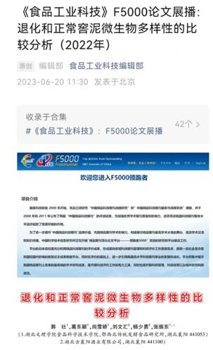 2022年12月29日,中国科学技术信息研究所举行了“中国科技论文统计报告发布会”,会上公布了《食品工业科技》16篇高质量论文入选了“精品科技期刊顶尖学术论文计划(F5000)”。其中,公司郭壮教授与湖北古襄阳酒业有限公司联合发表的学术论文——《退化和正常窖泥微生物多样性的比较分析》成功入选。这也是公司传统发酵食品团队发表的学术论文第4次入选F5000论文,表明了公司此项科技成果在全球范围内的高水准、高下载及高被引。